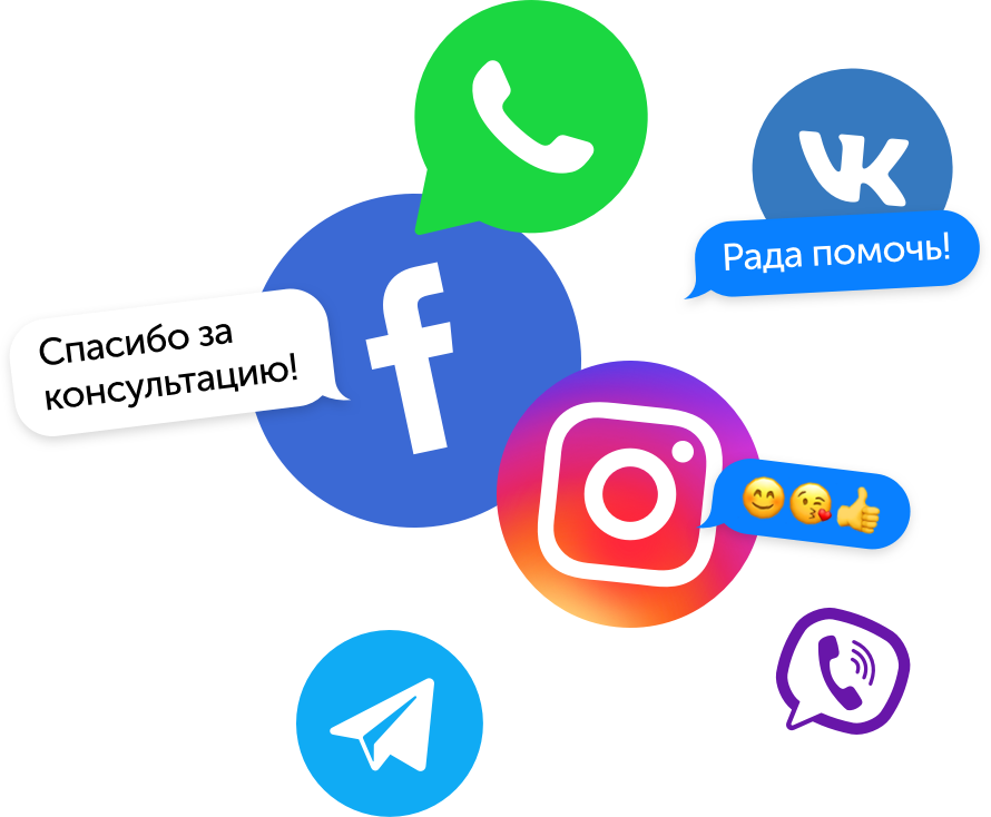 Получайте сообщения и отвечайте прямо из CRM в их любимых соцсетях или мессенджерах ВКонтакте, Facebook, Whatsapp, Instagram, Телеграм, Viber и Авито