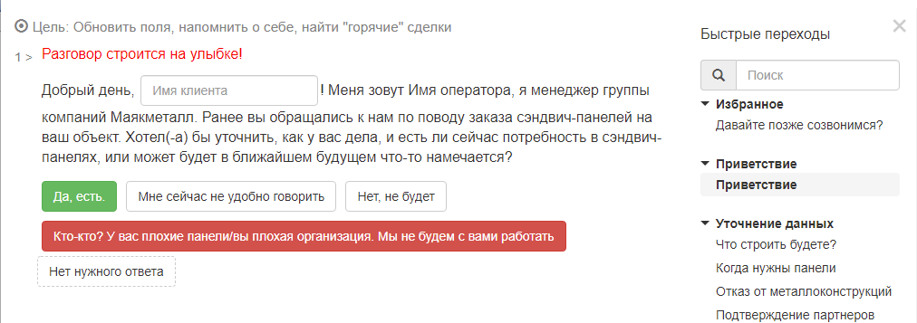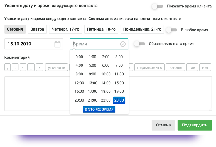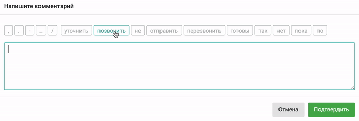 Менеджер может вбивать комментарии по сделке без помощи клавиатуры, просто выбирая мышкой нужные слова, которые автоматически будут подставляться из ранее введенных слов.