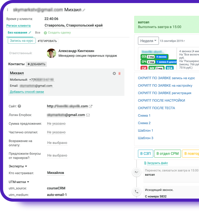 В учебном центре обучаем менеджеров этапам продаж в EnvyCRM, подкрученную нами под этот бизнес в комплексе с нужными интеграциями — чтобы все действия были автоматическими.