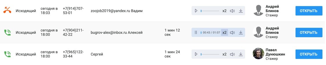 Просматривайте эффективность в подробных отчетах по менеджерам, по звонкам, по лидам, по письмам, по воронкам продаж, по этапам и по отказам. А также прослушивайте записи звонков с ускоренным режимом ×2.