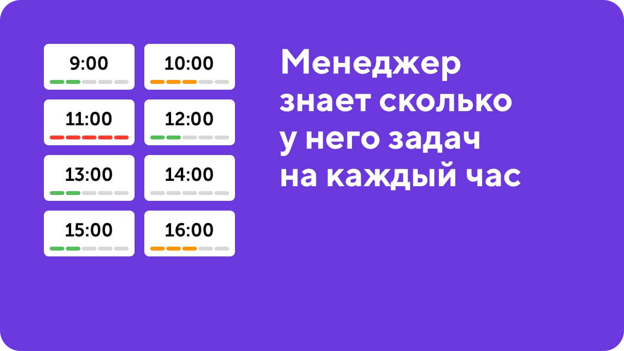 Сними ваш менеджер тратит на 95% меньше времени на рутинные операции и успевает сделать больше продаж и принести больше денег. А руководитель сможет контролировать нагрузку по задачам, чтобы сотрудник не перегружался и не растягивал клиентов на целый день.